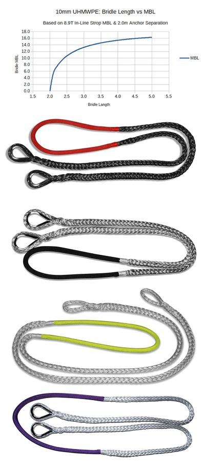It should also be noted that at obtuse bridle angles (i.e. strop length and anchor separation near-equal), the leg load may actually increase above the applied load. For a 2.2m bridle, at a separation of 2.0m, the bridle MBL would in fact be lower than the strop MBL, reducing to 10T.